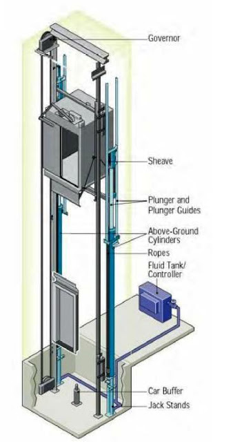 Usano una combinazione di funi e un pistone per spostare l'ascensore. La distanza massima di viaggio è di circa 60 piedi.